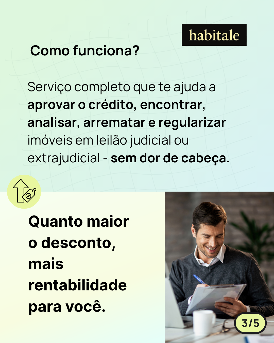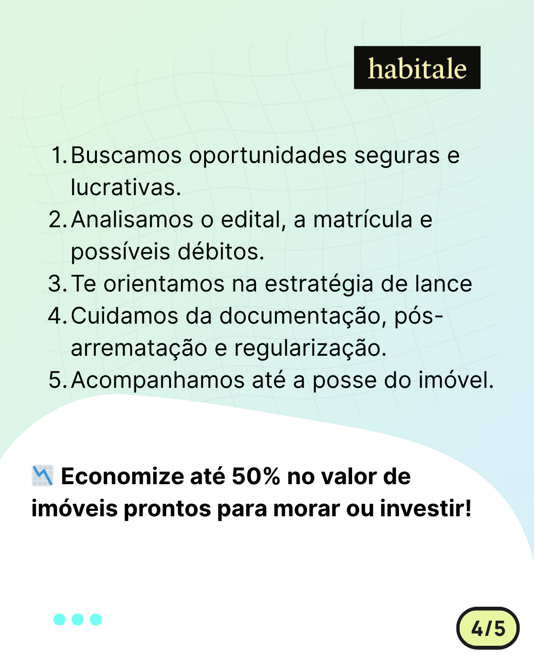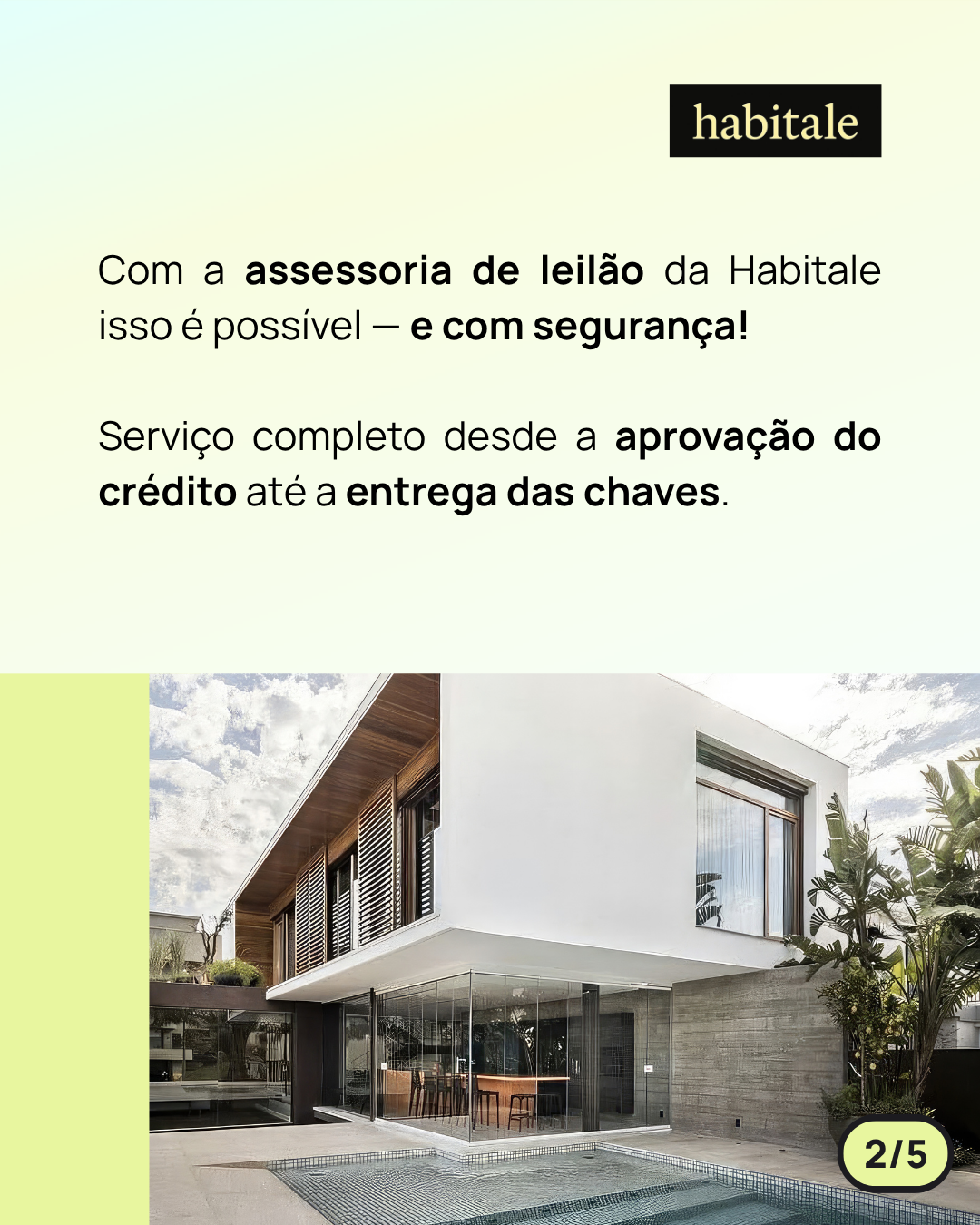 Além disso, o cliente pode contar com opções de arrematação de imóveis e financiamento em até 420 meses, com apenas 5% de entrada, tornando esse tipo de aquisição acessível tanto para investidores quanto para quem busca o primeiro ou próximo imóvel.