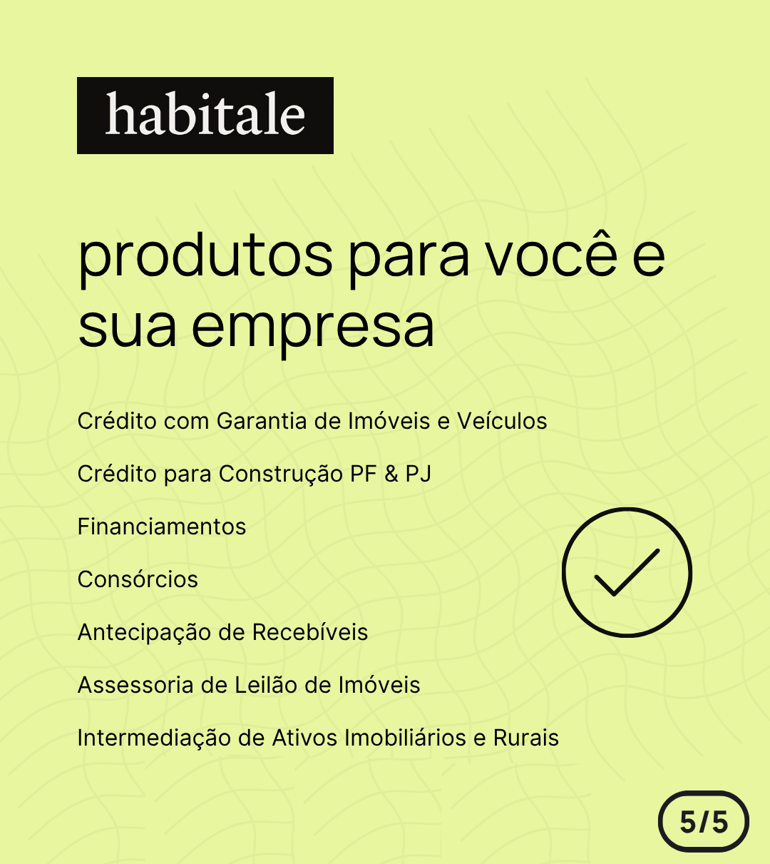 A Habitale também oferece assessoria especializada em crédito imobiliário, incluindo financiamento para aquisição e construção de imóveis, sempre buscando as melhores condições, taxas e prazos, de acordo com o perfil financeiro do cliente.