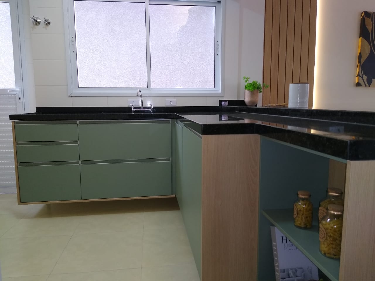 A cozinha é uma obra-prima, equipada com balcões em granito e uma pia de aço inoxidável. Os acabamentos de alta qualidade, como escadas em granito e pisos em porcelanato, conferem elegância e durabilidade.
