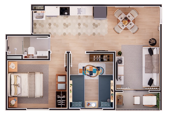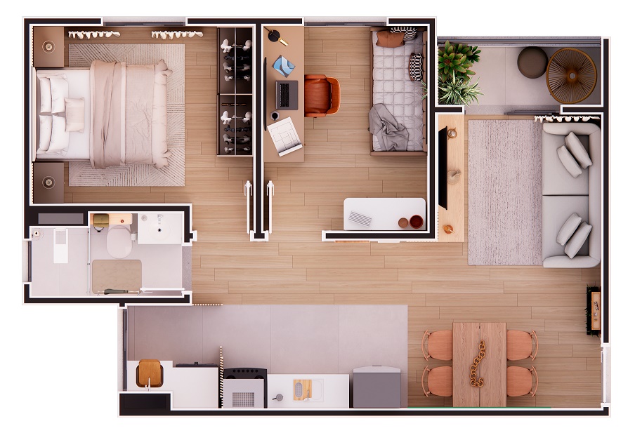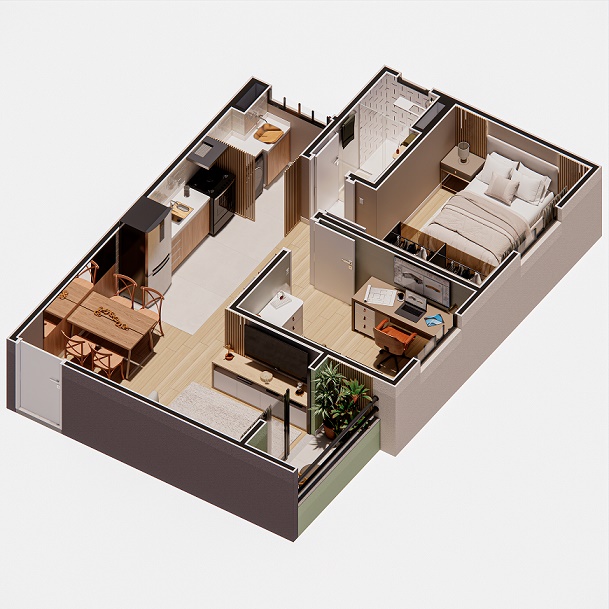 Aqui, você encontra apartamentos de 1, 2 e 3 dormitórios, todos com sacada e metragens de 40 m², 47 m², 49 m² e 81 m² — opções ideais para solteiros, casais e famílias que desejam mais espaço e conforto.
